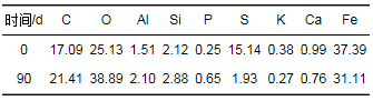 關聯硫鐵泥的腐蝕結果及微生物群落變化可輔助理解反應過程并對反應器的運行優(yōu)化具有指導意義.分別在第0和90 d, 從反應器中提取污泥樣品進行物理化學性質分析和高通量測序.從掃描電鏡圖 7(a)和圖 7(b)的對比可以看出, 硫鐵泥經微生物90 d腐蝕氧化作用, 在球狀骨料中有扁平狀和針狀次生礦物晶體形成, 這與Li等[14]用磁黃鐵礦進行反硝化脫氮研究所觀察到的現象比較相似. 圖 7(c)和圖 7(d)為污泥樣品的EDS分析, 對應的元素分析結果如表 3所示.很顯然, 硫元素的含量從15.14%下降到1.93%, 結合前面的水質指標, 表明硫鐵泥中的固相硫化物經微生物氧化轉化為溶解性的硫酸鹽, 同時釋放電子還原硝酸根; 鐵元素含量變化不明顯, 因為除了啟動初期, 整個運行過程中沒有鐵離子的大量溢出; 污泥中氧元素含量從25.13%升高到38.89%, 這可能是因為有大量二次礦物赤鐵礦(Fe2O3)的形成.
