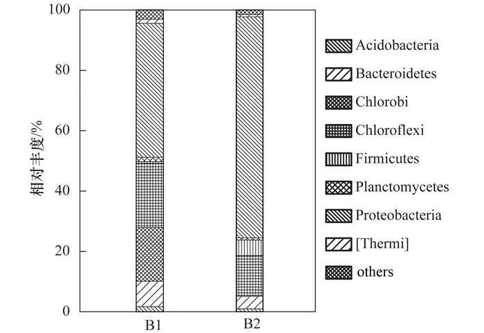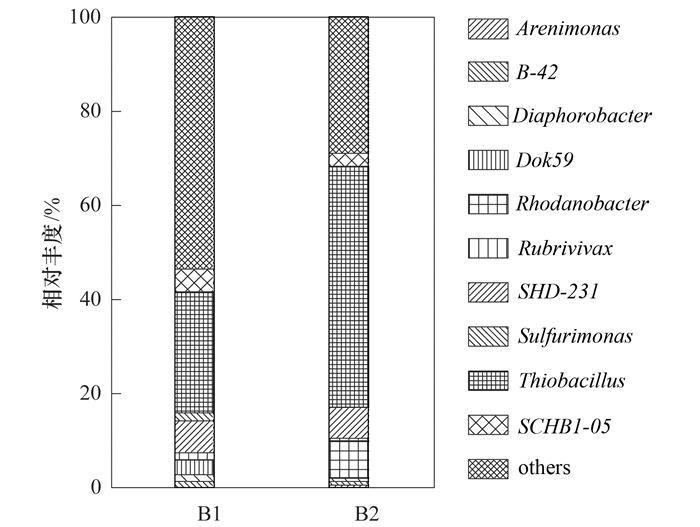 基于SILVL數據庫分類信息, 對反應器運行前后污泥樣品(B1、B2)的高通量測序數據進行門、屬水平上的分類分析.兩個樣品中門水平上的大量類群(相對豐度大于1)如圖 8所示.從中可知, 反應器接種的初始污泥中以Proteobacteria為優(yōu)勢菌群, 豐度為44.39%, 其次為Chloroflexi(21.27%)和Chlorobi(17.82%), 三者在總群落中的占比接近90%.此外, Bacteroidetes、Acidobacteria、Planctomycetes、[Thermi]也是初始污泥樣品中主要的門類.而穩(wěn)定運行90 d后反應器污泥中優(yōu)勢菌群為Proteobacteria、Chloroflexi、Firmicutes、Bacteroidetes, 豐度分別為73.22%、13.17%、5.15%、4.17%, 它們在總群落中的比例超過95%.運行初始和結束的污泥最主要的優(yōu)勢門雖均為Proteobacteria, 但其相對豐度存在明顯差異, 且初始污泥在門水平上的主要類群呈現多樣性.這個結果表明脫氮過程中污泥群落結構發(fā)生了顯著變化.