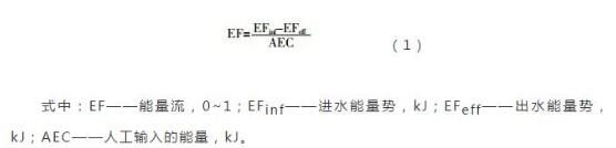 能量流分析是將進(jìn)出污水處理系統(tǒng)的各種污染物按照能量的方式統(tǒng)一計量,將污水處理廠的運行效果從物質(zhì)角度的多指標(biāo)評價轉(zhuǎn)化成從能量角度的單一指標(biāo)評價。能量流的定義如式(1)所示。