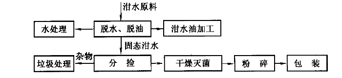 由于泔水具有較全面的營養(yǎng)成分,有再生利用價值,對于集中收集衛(wèi)生、新鮮的城市泔水,首先將其作脫水、脫油處理,然后對固態(tài)成分進(jìn)行干燥滅菌,再通過機(jī)械加工,生產(chǎn)出固體飼料,簡單流程見圖: