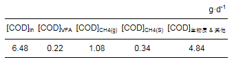 式中,[COD]in表示進(jìn)水COD;[COD]VFA表示以COD計(jì)算的出水中所含各類揮發(fā)酸總和,包括乙酸、丙酸、丁酸;[COD]CH4表示以甲烷形式去除的有機(jī)物,包括氣態(tài)及溶解在水中的甲烷,溶解在水中的甲烷通過(guò)亨利定律計(jì)算;[COD]生物質(zhì)&其他表示其他形式的有機(jī)物,包括用于生物質(zhì)的合成、轉(zhuǎn)化成痕量CO2、H2和其他形式的揮發(fā)酸及未被降解的有機(jī)物.