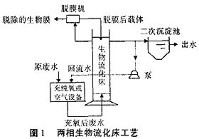 生物流化床技術(shù)是一種新型的生物膜法工藝,是繼流化床技術(shù)在化工領(lǐng)域廣泛應(yīng)用后于20世紀(jì)70年代初發(fā)展起來的。其載體在流化床內(nèi)呈流化狀態(tài),使固(生物膜)、液(廢水)、氣(空氣)3相之間得到充分接觸,顆粒之間劇烈碰撞,生物膜表面不斷更新,微生物始終處于生長旺盛階段。該技術(shù)使生化池各處理段中保持高濃度的生物量,傳質(zhì)效率極高,從而使廢水的基質(zhì)降解速度快,水力停留時間短,運轉(zhuǎn)負(fù)荷比一般活性污泥法高5~10倍,耐沖擊負(fù)荷能力強。按其生物膜特性等因素可分為好氧生物流化床和厭氧生物流化床兩大類。