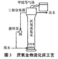 厭氧生物流化床可視為特殊的氣體進口速度為零的三相流化床。這是因為厭氧反應(yīng)過程分為水解酸化、產(chǎn)酸和產(chǎn)甲烷3個階段,床內(nèi)雖無需通氧或空氣,但產(chǎn)甲烷菌產(chǎn)生的氣體與床內(nèi)液、固兩相混和即成三相流化狀態(tài)。厭氧生物流化床工藝如圖3所示。為維持較高的上流速度,需采用較大的回流比。厭氧生物流化床內(nèi)微生物種群的分布趨于均一化,在床中央?yún)^(qū)域生物膜的產(chǎn)酸活性和產(chǎn)甲烷活性都很高,從而使其有效負(fù)荷大大提高。