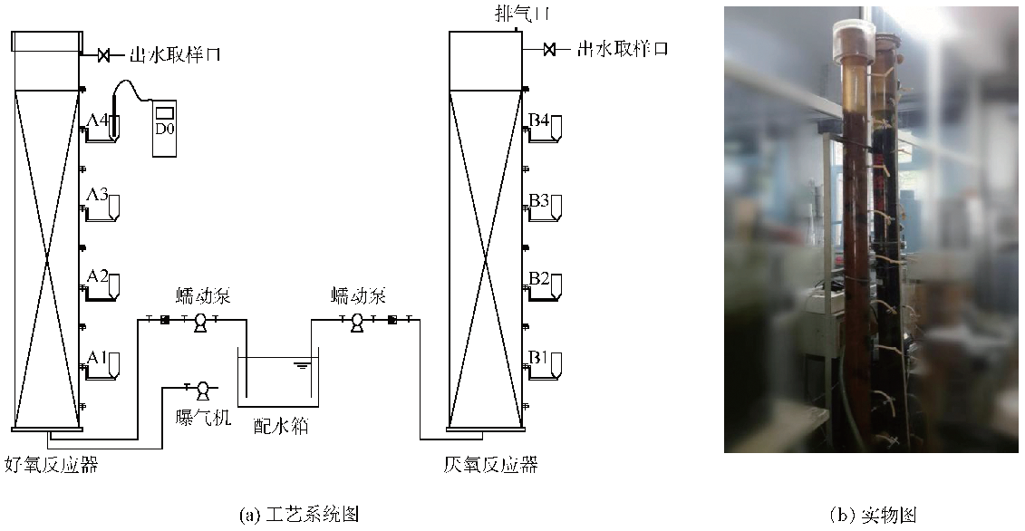實驗裝置見圖2。反應器采用有機玻璃材料制成,高度為2 000 mm,好氧反應器直徑100 mm,底部安裝有曝氣頭;厭氧反應器直徑110 mm;耦合生物載體填充深度(1 630±10) mm;反應器每隔400 mm設1個取樣口,共設8個。反應器均采用逆流下進上出的進水方式連續(xù)運行,通過進水計量泵來控制流速。
