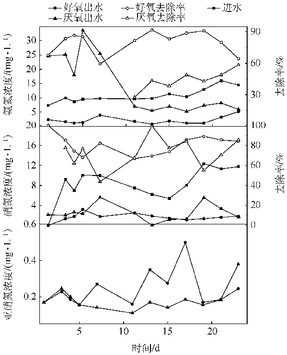 反應器運行初期,厭氧反應器出水氨氮濃度高于進水且有60%左右的硝酸鹽氮得到去除,表明初期硝酸鹽氮的還原主要是化學催化固體原電池反應的結果,并伴有氨氮的生成。隨掛膜培養(yǎng)時間的延長,硝酸鹽氮的去除率有所增加,且未出現(xiàn)亞硝酸鹽氮的積累,出水氨氮的濃度也明顯降低,由25.32 mg·L−1降到7.00 mg·L−1以下,說明厭氧反應器內硝酸鹽氮的還原由化學作用逐漸轉為以微生物反硝化作用為主。天然生物質分解的小分子物質為微生物掛膜生長、生物反硝化提供了有效碳源,縮短了反應器的啟動時間。好氧、厭氧反應器整體啟動較為迅速,在15 d左右硝酸鹽氮去除率分別達到87.5%和77.4%,表明掛膜成功,并在20 d逐步提升進水硝酸鹽氮濃度以適應模擬地下水的水質。
