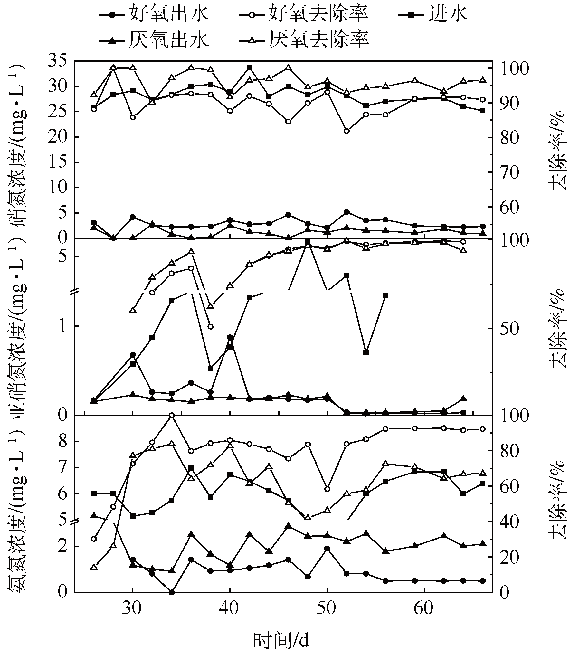 好氧反應器反硝化速率略低,厭氧反應器去除氨氮有限,為克服好氧反應器和厭氧反應器單獨運行的不足,將厭氧反應器與好氧反應器串聯(lián),進水水質見表1,HRT=12 h,好氧反應器DO=2.0 mg·L−1,厭氧反應器DO<0.1 mg·L−1,室溫22~25 ℃下穩(wěn)定運行43 d。實驗結果見圖8。由圖8可知,最終出水硝酸鹽氮的平均濃度為1.231 mg·L−1,達到《地下水質量標準》(GB/T 14848-2017)的Ⅰ類標準要求,且沒有亞硝酸鹽氮和氨氮的積累。表明串聯(lián)運行方式能在更短的HRT及較少的曝氣量下實現(xiàn)更高的總氮去除率,出水總氮濃度(2.090 mg·L−1)低于單獨運行時的好氧反應器(總氮濃度3.063 mg·L−1)和厭氧反應器(總氮濃度3.348 mg·L−1)。因此,利用厭氧反應器中反硝化作用去除硝酸鹽氮,好氧反應器中的硝化作用去除氨氮,有利于反應器發(fā)揮各自優(yōu)勢,實現(xiàn)更高效率的脫氮效果。