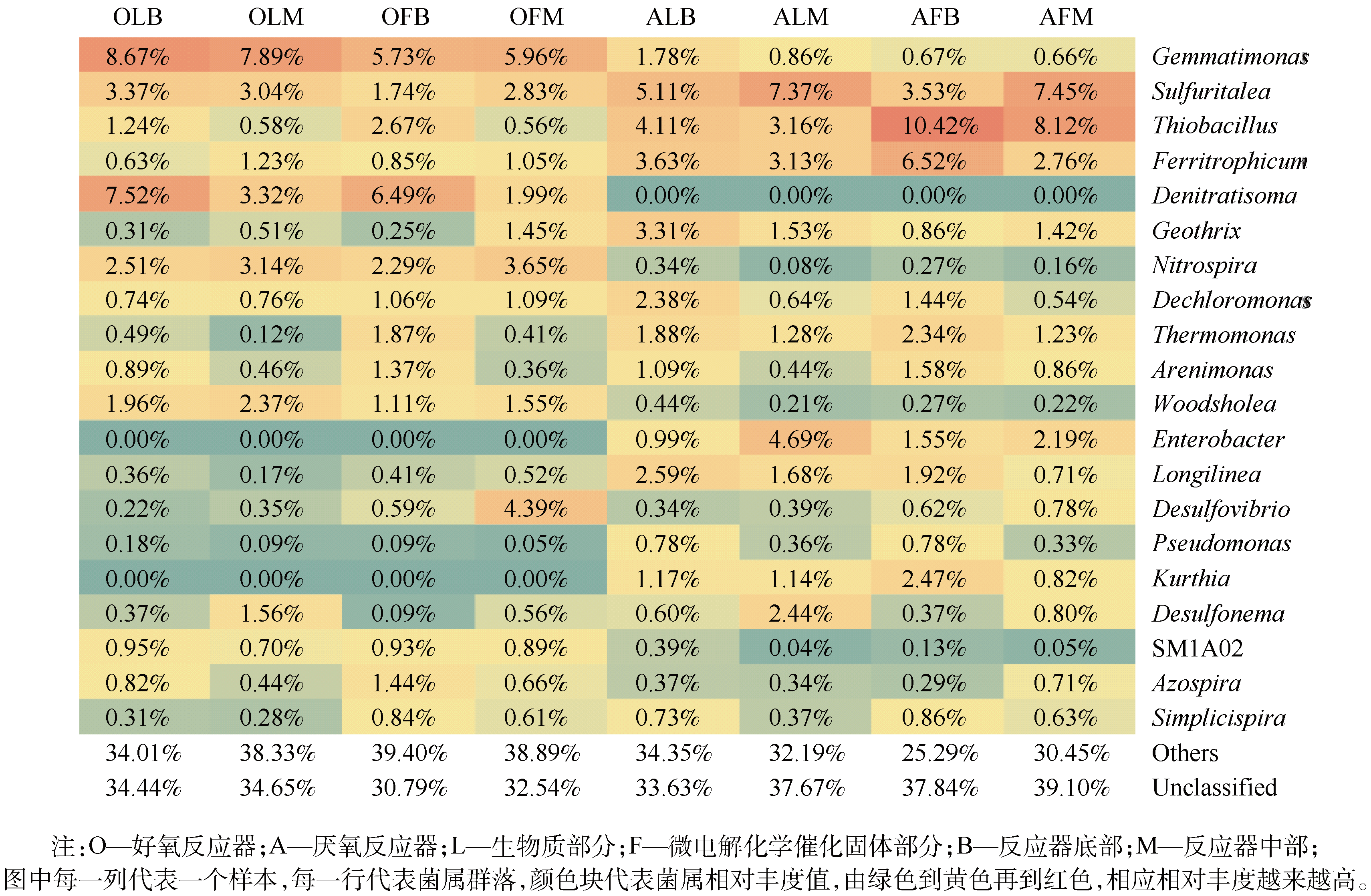 如圖9所示,占優(yōu)勢的菌如Sulfuritalea、Thiobacillus、Ferritrophicum、Denitratisoma等都具有反硝化功能,與報道相一致。WANG等的研究發(fā)現(xiàn)固態(tài)有機物與ZVI組合有協(xié)同作用,王蘇艷[33]也發(fā)現(xiàn)Fe2+和碳源有協(xié)同作用促進反硝化。此外鐵是生物氧化酶系統(tǒng)中細胞色素的重要部分,且Fe2+和Fe3+的氧化還原反應中電子傳遞可以促進生化反應速率。由于生物質分解、發(fā)酵產酸(HCO3−和CO2)可中和反硝化過程產生的堿度及微電解化學催化固體原電池反應產生的氫氧根,反應器出水pH在保持在7.5~8.6,適宜微生物生長繁殖,利于反硝化過程穩(wěn)定順利進行,且自呈緩沖體系,無需外加緩沖劑。在2個反應器內實現(xiàn)化學與生物相耦合的反硝化過程,此外好氧反應器中還實現(xiàn)了同步硝化反硝化,對模擬受污染地下水的脫氮有突出效果。