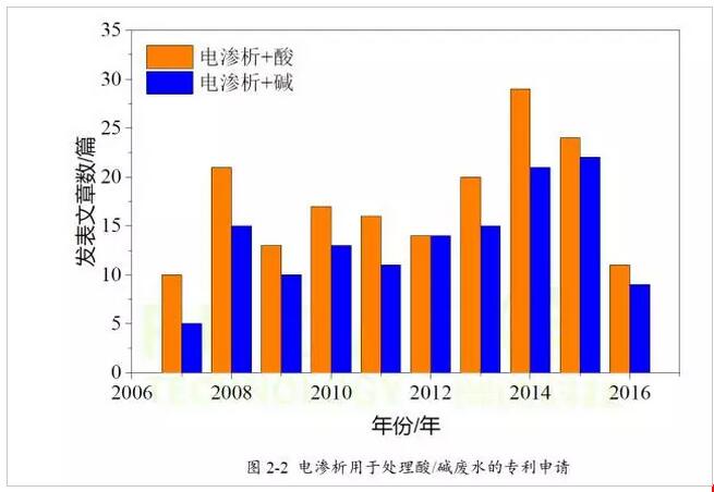 從檢索結(jié)果可知,有關(guān)電滲析技術(shù)在含酸/堿溶液方面的應(yīng)用,發(fā)表的文章也不多,但呈現(xiàn)出增多的趨勢。