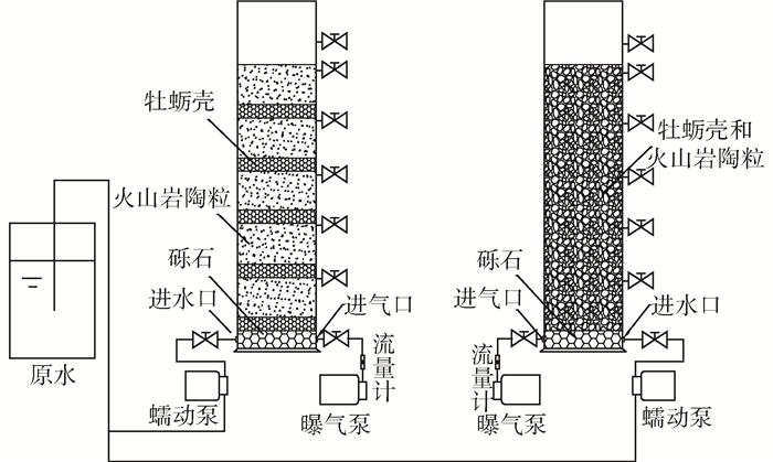 MSB-BAF和MB-BAF均為一體式混合床生物濾柱。濾柱采用有機PVC管加工而成,承托板設(shè)于柱體內(nèi)下部,礫石填入池體內(nèi)的承托板形成承托層,厚度為100 mm,進水口和進氣口均設(shè)于承托板上方50 mm處,濾柱填料層厚度為1 500 mm,牡蠣殼和陶粒直徑均為3~5 mm,出水口設(shè)于高度為400、700、1 000、1 300、1 600 mm處,濾柱總高度為2 000 mm。MSB-BAF內(nèi)牡蠣殼和陶粒填料以體積比為1:3的比例分層多級分布,采用多孔塑料板隔開,2種濾料間隔填充。MB-BAF內(nèi)牡蠣殼和陶粒填料以體積比為1:3的比例混合均勻后混合填充。采用連續(xù)曝氣方式,生物濾柱的溶解氧控制在3~4.5 mg·L-1,污水通過蠕動泵加壓后進入生物濾柱底部,處理后從濾柱上方的出水口溢流出水,水力停留時間為24 h,運行過程不排泥。實驗裝置見圖 1。