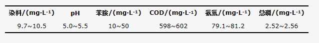 紡織廠工業(yè)廢水中的染料濃度范圍一般在10~200 mg·L-1,根據(jù)廈門市某紡織廠的生產(chǎn)廢水配制不同苯胺濃度的RBK5染料廢水,進水水質(zhì)見表 1。牡蠣殼陶粒生物濾柱中的未馴化污泥取自華僑大學(xué)中水處理站的曝氣池,活性污泥過篩后裝入連續(xù)曝氣的MSB-BAF和MB-BAF反應(yīng)器,加入生活污水進行污泥馴化,控制進水流速為170 mL·h-1。待反應(yīng)器內(nèi)的污泥馴化完成,出水水質(zhì)穩(wěn)定,加入一定量含苯胺的RBK5染料廢水開始運行過程。通過逐漸提高MSB-BAF和MB-BAF反應(yīng)系統(tǒng)的苯胺濃度進行活性污泥馴化。在運行過程中,每天取反應(yīng)器的進水、出水,分析其中染料、苯胺、COD、氨氮、總磷濃度以及pH值的變化。每個苯胺濃度梯度下,運行1~3周后,系統(tǒng)出水水質(zhì)基本穩(wěn)定,進入穩(wěn)定狀態(tài)繼續(xù)運行1周。
