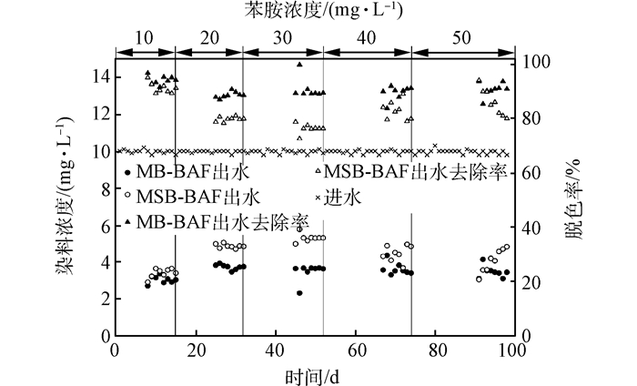 進水RBK5的濃度為10 mg·L-1,染料的脫色效果如圖 4所示,MSB-BAF和MB-BAF對染料的脫色率隨苯胺濃度的上升變化不大,平均脫色率分別為90.7%和83.2%,MB-BAF對染料的脫色效果要略微優(yōu)于MSB-BAF。其原因是經(jīng)過一段時間的馴化,生物濾柱填料表面形成了一定數(shù)量的RBK5脫色菌群,由于陶粒表面積更大,更加有利于負(fù)載微生物,因此大部分微生物都負(fù)載在陶粒表面,MB-BAF由于混合均勻更有利于脫色菌的固定化,而MSB-BAF由于分層后,脫色菌集中在陶粒層,因此引起停留時間略微縮短,導(dǎo)致MSB-BAF對RBK5的脫色率略低。