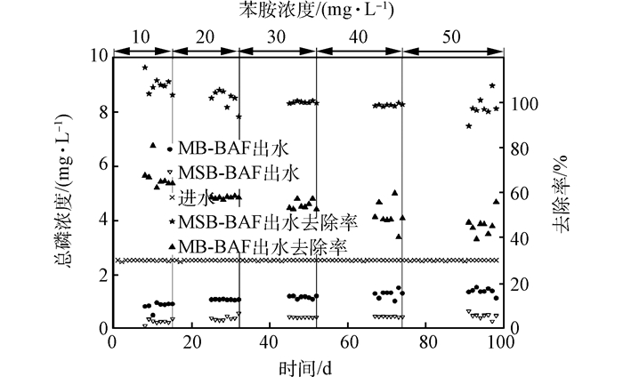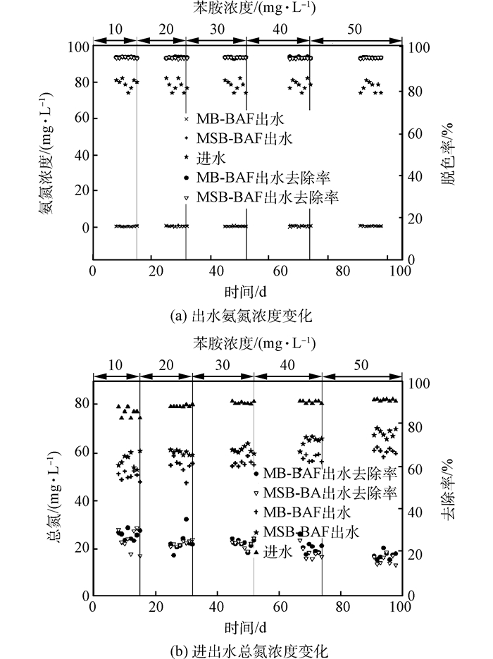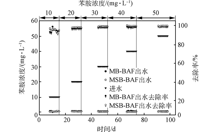 1) MSB-BAF和MB-BAF對苯胺、COD、氨氮、總磷的去除效果以及對染料的脫色效果明顯。苯胺濃度在10~50 mg·L-1變化,對COD、氨氮、苯胺、總磷的去除以及對染料的脫色影響不大。
