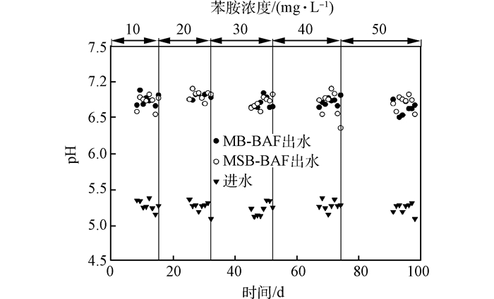 MSB-BAF和MB-BAF進出水的pH變化如圖 9所示。進水pH為5.0~5.5,出水pH維持在6.5~7.0之間。MSB-BAF和MB-BAF中的牡蠣殼填料含有CaCO3,在微酸性條件下, 牡蠣殼會發(fā)生部分溶解而放出Ca2+,可提供一定堿度,維持不同苯胺濃度下反應(yīng)器出水pH值的穩(wěn)定,避免在高氨氮條件下,由于硝化反應(yīng)造成的pH下降。