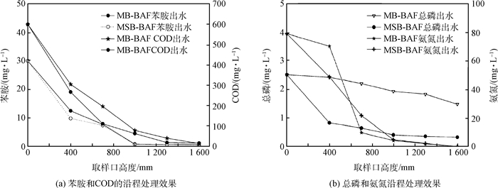 圖 10(a)為MSB-BAF和MB-BAF在苯胺濃度為30 mg·L-1時,對苯胺、COD沿程處理的效果變化。COD濃度沿程下降,在取樣口高度達(dá)到1 000 mm時,COD濃度基本穩(wěn)定,這是由于進水端附近COD、有機底物濃度高,生物量相對較高,沿程向上,水中有機污染物因為填料的吸附和微生物的降解濃度降低,生物量減少。苯胺的濃度在1 000 mm處也基本穩(wěn)定,可能1 000 mm以下的營養(yǎng)環(huán)境有利于苯胺降解菌的生長,使苯胺基本去除。MSB-BAF和MB-BAF 2個反應(yīng)器的沿程高度對苯胺和COD的去除能力差異不大。