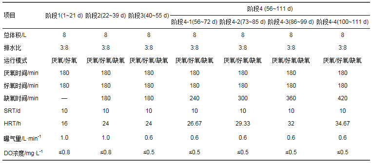實(shí)驗(yàn)用水為青島市某污水處理廠粗格柵前入口處的生活污水, 具體水質(zhì):COD濃度為253.79~372.48mg·L-1, NH4+-N濃度為52.15~82.07mg·L-1, NO2--N濃度<1mg·L-1, NO3--N濃度<2mg·L-1, PO43--P濃度為3.55~9.62mg·L-1, pH值為7.2~7.6.接種污泥取自本實(shí)驗(yàn)室運(yùn)行180 d具有良好脫氮除磷性能的SBR, 接種到反應(yīng)器內(nèi)后MLSS約3961 mg·L-1, SV約為32%, SVI約為80.79 mL·g-1.