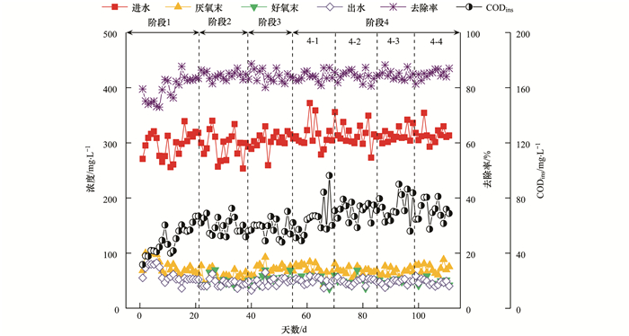 在階段4(56~111 d), 當(dāng)系統(tǒng)缺氧時(shí)間分別延長(zhǎng)至240、300、360和420 min時(shí), 厭氧末、好氧末和出水COD濃度分別平均為69.08、49.73和47.00mg·L-1. COD去除率穩(wěn)定維持在85.06%.說(shuō)明延長(zhǎng)缺氧運(yùn)行時(shí)間, 對(duì)系統(tǒng)COD的去除性能幾乎不造成影響.在階段4-1 (56~72 d), CODins逐漸升高, 由51.31mg·L-1逐漸升高至72.12mg·L-1; 在階段4-2~4-4(73~111 d), CODins維持穩(wěn)定, 平均為71.68mg·L-1.
