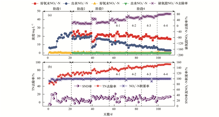 在階段4(56~111 d), 當(dāng)系統(tǒng)缺氧時(shí)間分別延長(zhǎng)至240、300、360和420 min時(shí), 好氧末NO3--N和出水NO3--N濃度穩(wěn)定維持在0.11mg·L-1和0.03mg·L-1. NO2--N積累率穩(wěn)定維持在99.68%, 說(shuō)明系統(tǒng)的同步短程硝化性能穩(wěn)定維持.好氧末NO2--N和出水NO2--N濃度分別由22.37mg·L-1和13.66mg·L-1逐漸降低至16.67mg·L-1和3.06mg·L-1; 缺氧段NO2--N去除率和TN去除率分別由38.94%和82.97%逐漸升高至81.64%和95.26%; SND率穩(wěn)定維持在28.01%.說(shuō)明, SPNDPR-PD系統(tǒng)TN去除性能的提高在于缺氧段時(shí)間的延長(zhǎng).