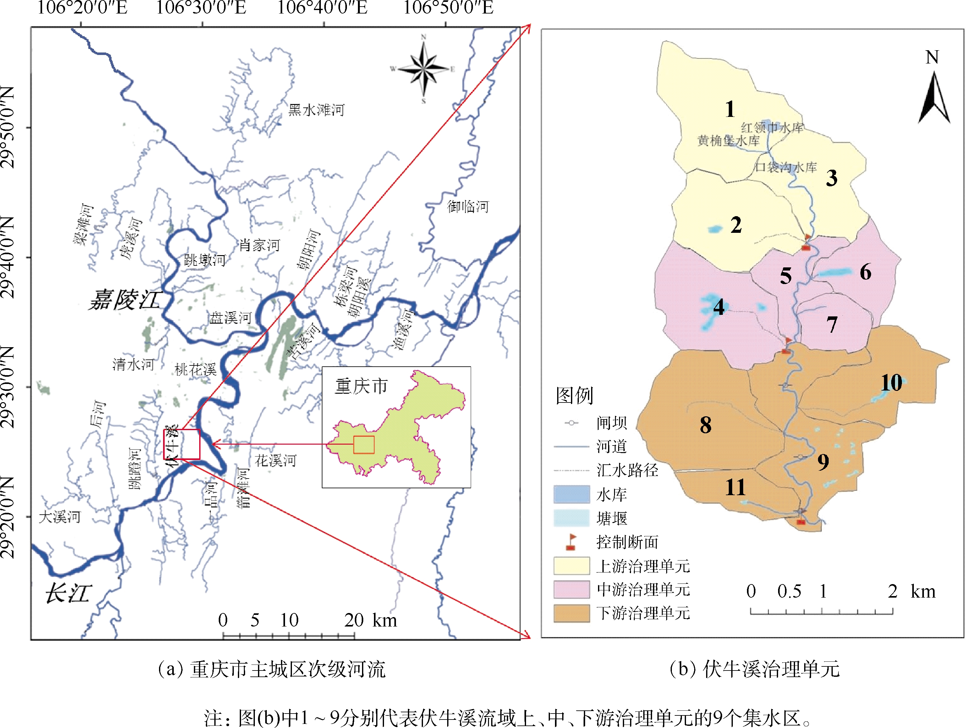 圖1 伏牛溪流域所在區(qū)位及其治理單元的劃分