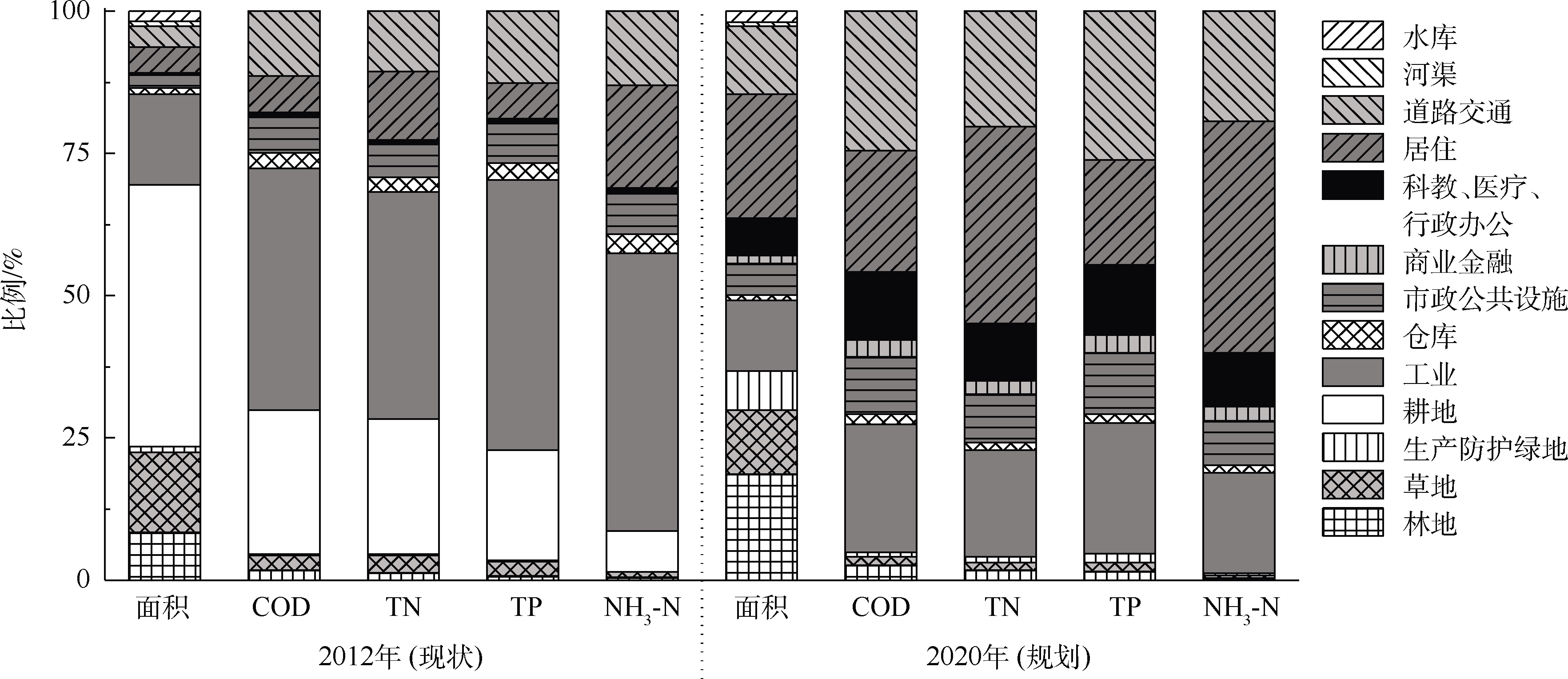 根據(jù)《重慶市人民政府關(guān)于大渡口區(qū)分區(qū)規(guī)劃的批復(fù)》(渝府[2005]119號(hào)),未來(lái)流域從以自然為主的耕地、林地、草地轉(zhuǎn)變?yōu)橐跃幼、工業(yè)、商用為主的土地類型。由于流域自然的透水性地表將大幅度減少、人為活動(dòng)的加強(qiáng),會(huì)產(chǎn)生更多城市地表徑流污染,將對(duì)區(qū)域水文、生態(tài)過(guò)程產(chǎn)生重要影響。相比于現(xiàn)狀,未來(lái)城市化進(jìn)程中COD、TN和TP面源污染負(fù)荷增加近2倍,其中最為顯著的是由透水性地表變?yōu)椴煌杆乇頌橹鞯牡缆方煌ㄅc居住用地占主導(dǎo)地位(圖3)。因此,在城市建設(shè)過(guò)程中,減少新增不透水地表徑流污染是保護(hù)城市開(kāi)發(fā)對(duì)河流水環(huán)境影響的重要途徑。與此同時(shí),負(fù)荷變化還產(chǎn)生于上游補(bǔ)水工程和流域土地利用變化。由于伏牛溪上游補(bǔ)水方案的實(shí)施,以城市污水廠退水為主的補(bǔ)給水源將給河流會(huì)帶來(lái)新的污染負(fù)荷。設(shè)計(jì)補(bǔ)水量為2×104 m3·d-1,補(bǔ)水將給河流增加負(fù)荷分別為292 t·a-1的COD、14.6 t·a-1的NH3-N(或TN)、2.92 t·a-1的TP。根據(jù)此預(yù)測(cè)結(jié)果,在未來(lái),由于土地利用類型變化和上游補(bǔ)水工程的實(shí)施,伏牛溪受納COD、NH3-N、TN和TP污染負(fù)荷將分別增加674、27.4、36.5和5.12 t·a-1,負(fù)荷的增加將會(huì)對(duì)河流水質(zhì)造成巨大沖擊,尤其是TN、TP,均超過(guò)水環(huán)境容量2倍以上(表4)。