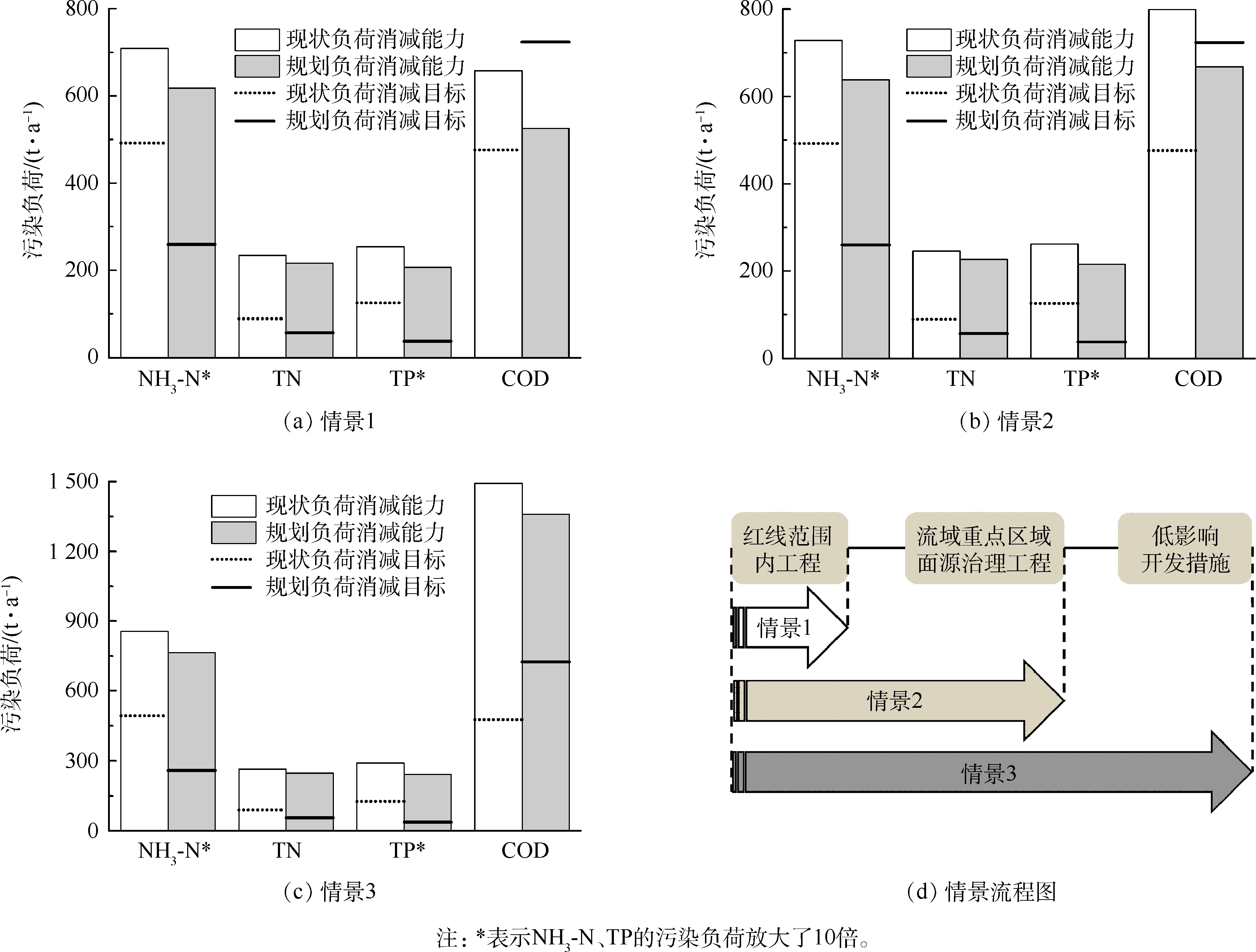 根據(jù)治理工程的負(fù)荷削減量,按照3種情景對(duì)負(fù)荷削減的目標(biāo)可達(dá)性進(jìn)行分析:情景1,僅實(shí)施紅線范圍內(nèi)工程;情景2,實(shí)施紅線范圍內(nèi)工程和流域重點(diǎn)區(qū)域面源治理工程;情景3,實(shí)施紅線范圍內(nèi)工程,包括流域重點(diǎn)區(qū)域面源治理工程和低影響開(kāi)發(fā)措施。分析考慮現(xiàn)狀和規(guī)劃2種條件,其中規(guī)劃條件下排污口全部截污,排污口截污工程的負(fù)荷削減量不計(jì)入在內(nèi)?梢钥吹剑诂F(xiàn)狀條件下,僅實(shí)施紅線范圍內(nèi)工程(情景1)就可保證所有污染物削減目標(biāo)的實(shí)現(xiàn);而在規(guī)劃條件下,COD負(fù)荷削減目標(biāo)明顯增加,同時(shí)實(shí)施紅線范圍內(nèi)工程和流域重點(diǎn)區(qū)域面源治理工程(情景1和情景2)均不能保證COD削減目標(biāo)的實(shí)現(xiàn),只有情景3才能保證全部污染負(fù)荷的削減目標(biāo)實(shí)現(xiàn)(圖5)。綜上分析,為保障流域水環(huán)境治理目標(biāo)在現(xiàn)狀和規(guī)劃條件下都能順利實(shí)現(xiàn),推薦按照情景3開(kāi)展治理措施。具體聯(lián)系污水寶或參見(jiàn)http://wlmqsb.com更多相關(guān)技術(shù)文檔。