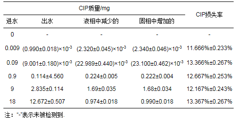 表 2顯示了CIP在生物處理過程中各系統(tǒng)的質(zhì)量平衡狀況.可以看出, 在所有的SBR系統(tǒng)中, CIP在液相中減少的部分主要轉(zhuǎn)移到了固相.隨著進水中CIP濃度的升高, 總CIP在反應(yīng)過程中的損失率始終維持在11%~13%左右, 說明進水中CIP的主要去除途徑是生物吸附但同時生物降解也有一定的潛力.可能是隨著CIP濃度的升高, 系統(tǒng)中富集了降解CIP的微生物, 一部分CIP被微生物降解.當(dāng)進水CIP質(zhì)量分別為0.009、0.09和0.9 mg時, 出水中CIP含量較低, 而當(dāng)進水CIP質(zhì)量分別為9和18 mg時, 出水中CIP含量較高.說明活性污泥在SBR系統(tǒng)中對CIP有一定的吸附作用, 但高含量CIP(9和18 mg)在生物脫氮除磷系統(tǒng)中很難被去除, 這一結(jié)果與相關(guān)文獻報道相一致(Li et al., 2010;Girardi et al., 2011;Mougin et al., 2013).相關(guān)實驗室的吸附研究也證實了CIP被好氧生物體吸附的潛力(Wu et al., 2009).CIP進入污水處理廠的質(zhì)量流量分析同樣表明, 大約80%流入的CIP與厭氧消化污泥有關(guān)(Golet et al., 2003;Lindberg et al., 2006).以上研究表明, 活性污泥對污水中的CIP有一定的去除性能, CIP的去除主要是通過活性污泥吸附的形式實現(xiàn).