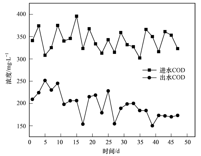 由于厭氧氨氧化反應(yīng)功能菌世代時間長, 生長條件苛刻, 在有機(jī)物濃度過高的情況下, 反應(yīng)過程和脫氮效果極易受到影響, 為保證ABR段出水中有機(jī)物濃度不對后續(xù)CANON系統(tǒng)中ANAMMOX菌產(chǎn)生影響, 本實驗在ABR系統(tǒng)和CANON系統(tǒng)耦合之前, 對ABR系統(tǒng)做單獨運行.如圖 3, 進(jìn)水COD在300~400 mg ·L-1之間, HRT為6 h, 經(jīng)過45 d運行, 出水COD由250 mg ·L-1左右逐漸下降至170 mg ·L-1左右.