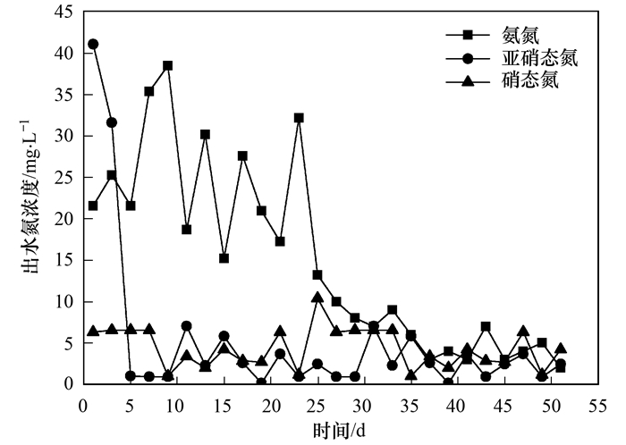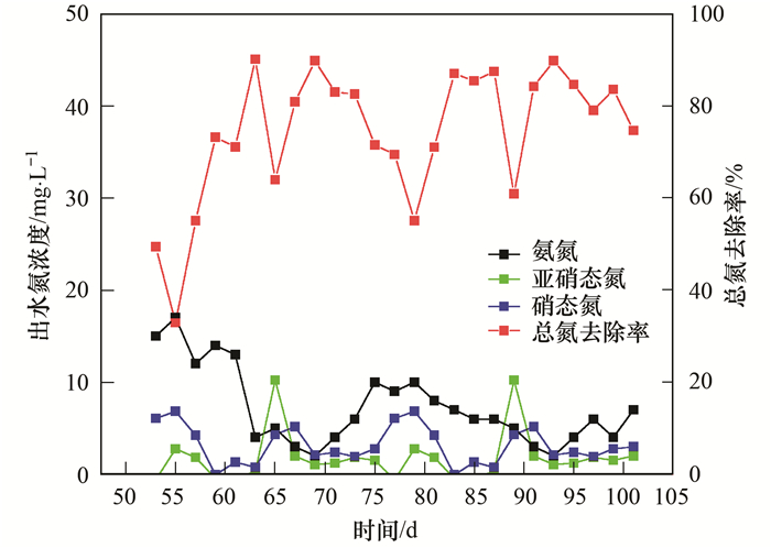 混合亞硝化污泥和厭氧氨氧化污泥后, 在CANON啟動過程中, 控制HRT為6 h、氨氮負(fù)荷為0.195 kg ·(m3 ·d)-1, 為避免DO對ANAMMOX菌產(chǎn)生影響, 且保證AOB能夠利用DO進(jìn)行短程硝化, 控制DO為0.5 mg ·L-1.在啟動反應(yīng)器的前5 d, 在進(jìn)水NH4+-N為43~47 mg ·L-1時, 出水NH4+-N為21~25 mg ·L-1, NO3--N維持在6 mg ·L-1左右, 然而出水亞硝態(tài)氮卻高達(dá)31~41 mg ·L-1 (如圖 2).這是因為微生物所在環(huán)境的改變, 使得接種的厭氧氨氧化污泥中微生物生長繁殖受到抑制因而發(fā)生細(xì)胞自溶, 從而釋放出大量的NH4+-N, NH4+-N又被氨氧化菌(AOB)氧化為NO2--N, 故而導(dǎo)致出水NO2--N較高.在隨后5~10 d里, 出水NH4+-N濃度持續(xù)升高至38 mg ·L-1, 出水NO2--N下降至1 mg ·L-1以下, 出水NO3--N亦下降至2~4 mg ·L-1, 表明此時曝氣量提供的DO已不能滿足反應(yīng)器的需求, 過低的曝氣量致使大量的NH4+-N未能被AOB利用, 厭氧氨氧化菌(ANAMMOX)只能利用AOB產(chǎn)生的少量NO2--N與進(jìn)水NH4+-N產(chǎn)生氮氣, 總氮去除率為14%~17%, CANON脫氮效果低下.故在CANON啟動的第11 d調(diào)高曝氣量, 此時DO達(dá)到1.2 mg ·L-1, 出水NH4+-N迅速降低, NO2--N略有升高至5~7 mg ·L-1, NO3--N濃度基本不變, 維持在2~6 mg ·L-1, 反應(yīng)器性能得以迅速提升.在接下來的40 d中, 根據(jù)出水氨氮情況的變化, 調(diào)節(jié)曝氣量, DO逐漸升高至2 mg ·L-1, 出水NH4+-N穩(wěn)定在2~7 mg ·L-1、NO2--N為0~3 mg ·L-1, NO3--N為2~4 mg ·L-1, TN去除率為81%~87%, 反應(yīng)器性能穩(wěn)定.具體聯(lián)系污水寶或參見http://wlmqsb.com更多相關(guān)技術(shù)文檔。