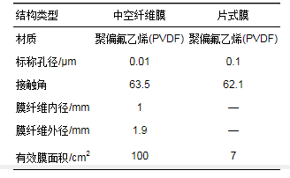 本實(shí)驗(yàn)所用PVDF中空纖維超濾膜膜絲, 在杭州衛(wèi)士環(huán)保科技有限公司購(gòu)買(mǎi), 超濾膜組件自制而成; PVDF片式膜, 膜購(gòu)自默克密理博公司, 剪裁為直徑3 cm與針孔過(guò)濾器進(jìn)行組裝, 制成膜組件進(jìn)行過(guò)濾實(shí)驗(yàn), 具體參數(shù)見(jiàn)表 2.