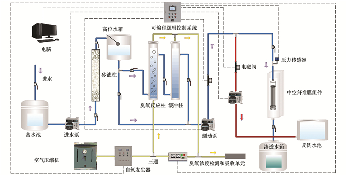 本實(shí)驗(yàn)中膜組件改性、水體氧化和超濾實(shí)驗(yàn)使用連續(xù)流裝置完成, 該裝置使用恒流-死端方式運(yùn)行, 過(guò)濾水樣為實(shí)際污水二級(jí)出水.實(shí)驗(yàn)設(shè)計(jì)4組平行實(shí)驗(yàn), 分別為:原水+原膜; 原水+CNT改性膜; 氧化水+原膜; 氧化水+CNT改性膜.實(shí)驗(yàn)在室溫(20±1)℃下進(jìn)行, 裝置流程如圖 1所示, 由砂濾單元, 臭氧預(yù)氧化單元, 膜濾單元和自控單元共4和單元構(gòu)成.二級(jí)出水經(jīng)過(guò)砂濾柱后, 一部分直接進(jìn)入膜濾單元, 另一部分進(jìn)入預(yù)氧化單元.臭氧預(yù)氧化單元內(nèi), 干燥空氣經(jīng)過(guò)空氣壓縮機(jī)(GC-ready SPB-2000, 北京北分索思科技有限公司)后進(jìn)入臭氧發(fā)生器(LAB2B, 英國(guó)TRIOGEN), 并利用臭氧分析儀(UV-2100, 美國(guó)IDEAL)測(cè)定臭氧產(chǎn)量.臭氧由底部進(jìn)入臭氧反應(yīng)柱, 與臭氧反應(yīng)后的水進(jìn)入緩沖柱, 反應(yīng)柱與緩沖柱溢出的臭氧經(jīng)收集后由尾氣吸收裝置吸收.本實(shí)驗(yàn)中臭氧投加量與CNT負(fù)載的選擇為0.22 mg·mg-1與3g·m-2, 詳細(xì)選擇原因請(qǐng)參考文獻(xiàn), 膜組件改性的詳細(xì)方法參考文獻(xiàn).本實(shí)驗(yàn)主要研究在臭氧-CNT膜改性聯(lián)用工藝下膜組件閾通量的變化.自控單元主要由可編程邏輯控制器(programmable logic controller, PLC)和電腦構(gòu)成, 能夠?qū)崿F(xiàn)對(duì)電磁閥、蠕動(dòng)泵、壓力傳感器、臭氧發(fā)生器、臭氧分析儀的自動(dòng)控制和數(shù)據(jù)傳輸.通過(guò)自控單元可以對(duì)跨膜壓差(trans-membrane pressure, TMP)、進(jìn)水通量、進(jìn)水時(shí)間、反洗通量和反洗時(shí)間進(jìn)行自動(dòng)控制.