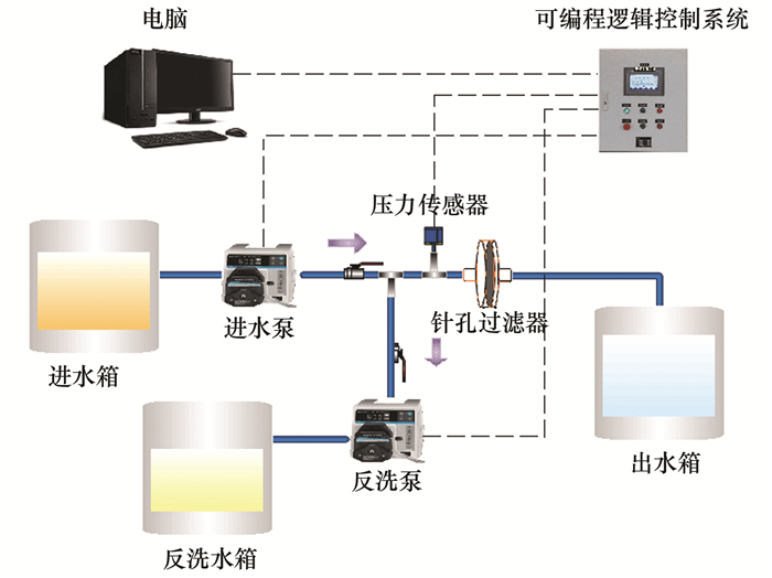 為了研究膜濾進(jìn)程中的碳平衡, 更好地對(duì)進(jìn)水、出水、反洗水進(jìn)行收集與測(cè)定, 故設(shè)計(jì)一套小型PVDF片式膜過(guò)濾裝置研究使用. PVDF片式膜面積小, 具有使用水量小, 管路損失小的特點(diǎn), 能夠更加精密地滿足實(shí)驗(yàn)要求.片式膜過(guò)濾裝置工藝流程圖如圖 2所示.