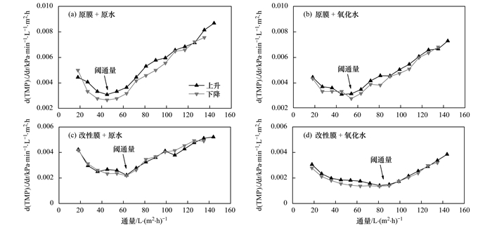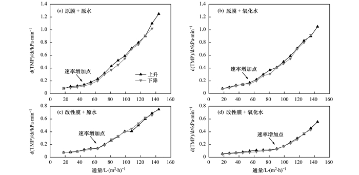 圖 5為圖 4中各個(gè)膜組件dTMP/dt, 得出各通量下TMP增長(zhǎng)速率, 由于使用預(yù)壓縮階梯通量法, 所以在過(guò)濾進(jìn)程中有通量上升和下降兩階段, 可以通過(guò)這兩階段數(shù)據(jù)是否一致來(lái)判斷, 得出數(shù)據(jù)的準(zhǔn)確性.從中可以看出各個(gè)膜組件的TMP增長(zhǎng)速率均有平緩上漲階段和加速上漲階段, 即其中標(biāo)注出的速率增加點(diǎn)前后.觀察圖 5(a)在速率增加點(diǎn)前, TMP增長(zhǎng)速率約為0.1 kPa·min-1, 速率增加點(diǎn)后TMP增長(zhǎng)速率變化迅速, 在Jmax點(diǎn)已經(jīng)達(dá)到1.25 kPa·min-1; 觀察圖 5(b)在速率增加點(diǎn)前, TMP增長(zhǎng)速率同樣約為0.1kPa·min-1, 但在Jmax點(diǎn)TMP增長(zhǎng)速率達(dá)到1.05 kPa·min-1; 圖 5(c)、5(d)具有類似結(jié)果, 在速率增加點(diǎn)前TMP增長(zhǎng)速率同約為0.1kPa·min-1, 而Jmax點(diǎn)TMP增長(zhǎng)速率分別為0.75 kPa·min-1、0.5 kPa·min-1; 對(duì)比4圖中Jmax點(diǎn)TMP增長(zhǎng)速率得到原膜+氧化水、改性膜+原水、改性膜+氧化水在Jmax運(yùn)行時(shí)TMP增長(zhǎng)速率相比原膜+原水膜組件分別減少了16%、40%、60%.表明臭氧-CNT膜改性聯(lián)用工藝與原膜相比能夠降低過(guò)濾進(jìn)程中的壓力增長(zhǎng)速率.