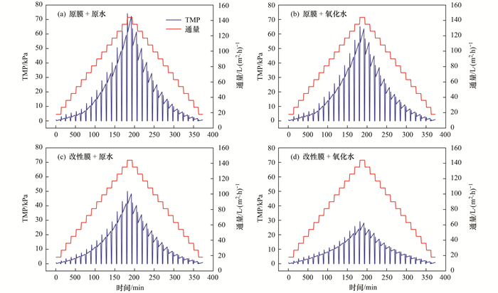 圖 4為使用預(yù)壓縮階梯通量法對(duì)膜組件進(jìn)行壓力測(cè)試的TMP變化, 由圖 4(a)中可以看出, 在最大通量Jmax時(shí), 膜組件TMP最大為72.3 kPa; 圖 4(b)中最大通量Jmax運(yùn)行時(shí), 膜組件TMP最大為63.5 kPa; 圖 4(c)中最大通量Jmax運(yùn)行時(shí), 膜組件TMP最大為48.3 kPa; 圖 4(d)中最大通量Jmax運(yùn)行時(shí), 膜組件TMP最大為28.1 kPa; 通過(guò)對(duì)比以上數(shù)據(jù)能夠得出, 原膜+氧化水、改性膜+原水、改性膜+氧化水在Jmax運(yùn)行時(shí)TMP相比原膜+原水膜組件分別減少了12.2%、33.2%、61.1%.結(jié)果表明在預(yù)壓縮階梯通量法運(yùn)行下, 改性膜+氧化水TMP增長(zhǎng)最為緩慢, 抗污染性最強(qiáng).