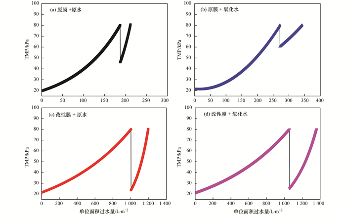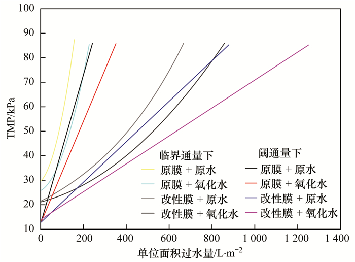 從圖 7中可見(jiàn), 在相同過(guò)濾條件下, 閾通量運(yùn)行得到的單位面積過(guò)水量大于臨界通量下運(yùn)行.原膜+原水膜組件相比臨界通量, 閾通量下過(guò)水能力從157 L·m-2提升到242 L·m-2, 提高了54.3%;原膜+氧化水膜組件相比臨界通量, 閾通量下過(guò)水能力從226 L·m-2提升到352 L·m-2, 提高了55.3%;改性膜+原水膜組件相比臨界通量, 閾通量下過(guò)水能力從667 L·m-2提升到881 L·m-2, 提高了32.1%;改性膜+氧化水膜組件相比臨界通量, 閾通量下過(guò)水能力從858L·m-2提升到1250 L·m-2, 提高了45.6%;表明閾通量下能夠延長(zhǎng)膜組件的過(guò)水能力, 閾通量下膜污染增長(zhǎng)更緩慢.這說(shuō)明, 在運(yùn)行中閾通量具有更高的指導(dǎo)意義, 能夠保證膜組件運(yùn)行更加穩(wěn)定.