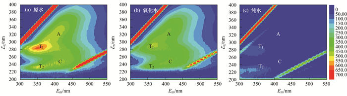 圖 10為對(duì)過(guò)濾進(jìn)程中原水、氧化水、純水的EEM測(cè)定.表 4為運(yùn)行過(guò)程中進(jìn)水、出水和反洗水中主要污染物質(zhì)熒光峰位置及強(qiáng)度值.根據(jù)文獻(xiàn)[22, 23]對(duì)水中常見(jiàn)污染物熒光分析的研究得出T1、T2、A、C這4種主要物質(zhì), 其分別對(duì)應(yīng)色氨酸類蛋白、酪氨酸類蛋白、可見(jiàn)腐殖質(zhì)、UV腐殖類質(zhì).