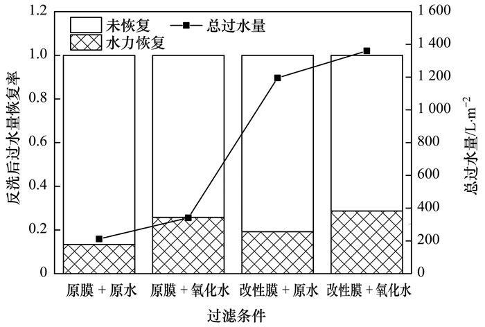 圖 8為片式膜PVDF過(guò)濾裝置純水反洗前后的TMP變化.可以觀察到反洗前TMP增長(zhǎng)與前期實(shí)驗(yàn)結(jié)果相同, 臭氧-CNT膜改性聯(lián)用工藝效果最佳.經(jīng)純水反洗后, 原膜過(guò)濾原水TMP恢復(fù)到45 kPa, 原膜過(guò)濾氧化水TMP恢復(fù)到55 kPa左右, 而CNT改性膜過(guò)濾原水與氧化水TMP均能夠恢復(fù)到20 kPa左右.這表明負(fù)載CNT能夠提高膜組件的水力恢復(fù)性能.根據(jù)反洗前后的過(guò)水量, 可以得到每個(gè)片式膜的水力反洗過(guò)水量恢復(fù)率, 如圖 9所示.從中可知, 原膜+原水、原膜+氧化水、改性膜+原水和改性膜+氧化水總過(guò)水量分別為212.1、341、1195和1360.2 L·m-2, 過(guò)水量恢復(fù)率分別為13.3%、25.8%、19.2%和28.6%, 即原膜+原水的過(guò)水量最少、恢復(fù)率最低, 改性膜+氧化水的過(guò)水量最多、恢復(fù)率最高.該結(jié)果表明, 臭氧-CNT膜改性工藝不僅能夠提高膜組件的抗污染性, 同時(shí)增加了反洗后的恢復(fù)率.