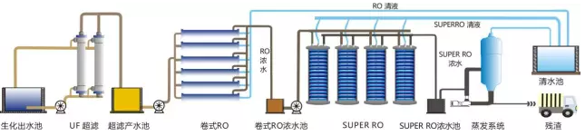 本系統(tǒng)工藝主要采用原反滲透濃水進(jìn)入倒極電驅(qū)動(dòng)膜分離器系統(tǒng)+二級(jí)反滲透+EDI系統(tǒng);赜盟档诫妼(dǎo)率1000μS/cm后,進(jìn)入反滲透系統(tǒng),達(dá)到電導(dǎo)率5μS/cm以內(nèi),反滲透產(chǎn)出淡水進(jìn)入EDI系統(tǒng),反滲透產(chǎn)出濃水進(jìn)入倒極電滲析系統(tǒng)。電滲析產(chǎn)出的濃水進(jìn)入濃縮水箱。EDI產(chǎn)出濃水進(jìn)入二級(jí)反滲透系統(tǒng),EDI產(chǎn)出淡水達(dá)到15MΩ,進(jìn)入產(chǎn)水罐。采用本工藝,既為企業(yè)解決了電廠鍋爐補(bǔ)給用水,又可使企業(yè)廢水達(dá)到零排放。