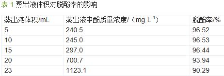 在25 mL 水煤氣廢水中加入0.9 g 氫氧化鈉,攪拌10 min 后蒸餾。蒸出液體積不同時,其對脫酚率的影響見表 1。