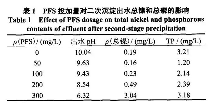 在二次沉淀反應(yīng)后,向廢水中投加一定量的5%(質(zhì)量分數(shù))聚合硫酸鐵進行攪拌反應(yīng),靜置沉淀后,取上清液測定pH、總鎳和總磷,以考察聚合硫酸鐵的投加對二次沉淀出水總鎳和總磷的影響,結(jié)果如表1所示。