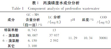 丙溴磷(profenofos) 是20 世紀(jì)70 年代后期由汽巴-嘉基公司開發(fā)的農(nóng)藥品種,對抗性害蟲表現(xiàn)出高活性,特別對抗性棉鈴蟲效果突出。該品種于2005 年被國家列入替代高毒有機(jī)磷農(nóng)藥品種之一,具有良好的發(fā)展前景。目前國內(nèi)有十余家企業(yè)生產(chǎn),每生產(chǎn)1 t 產(chǎn)品約產(chǎn)生6~7 t 廢水,該廢水由于色重、味臭、毒性大無法直接生化,必須先經(jīng)過預(yù)處理,否則無法達(dá)標(biāo)排放。近年來,國內(nèi)對該廢水的處理雖有所報道,但著重點在于如何從溴化工段廢水中回收溴素,且溴素回收目前已成為工業(yè)生產(chǎn)必不可少的工段,因此車間所排廢水幾乎不含溴,而文獻(xiàn)對混合廢水的主要污染成分酚的處理卻未見報道。通過對某生產(chǎn)企業(yè)提供的丙溴磷混合廢水進(jìn)行分析(見表1),發(fā)現(xiàn)其主要成分為4-溴-2-氯苯酚(簡稱4-溴氯酚),該成分為丙溴磷生產(chǎn)中的原料,因此找到從廢水中回收4-溴氯酚的合適方法就成為治理廢水污染、降低生產(chǎn)成本的關(guān)鍵。