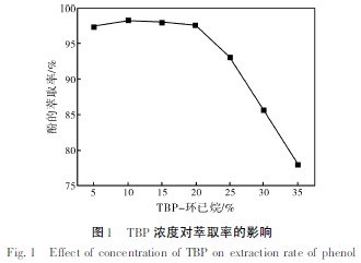 (1) 硫酸酸化含酚廢水,在pH=3~4,溫度30 ℃條件下,采用10%廢水體積、5%TBP-環(huán)己烷溶液萃取丙溴磷含酚廢水,攪拌30 min 能夠達(dá)到很好的萃取除酚效果。廢水中酚的萃取率可達(dá)95%。