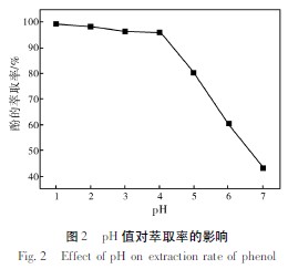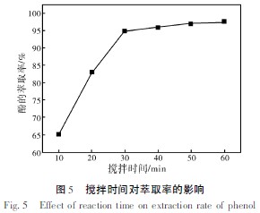 由圖2 可知,廢水的酸性越強(qiáng)萃取效果越好。pH 值在1 ~4 時酚的萃取率能達(dá)到95% 以上。當(dāng)pH 值大于4 時,酚的萃取率迅速下降,這是因為當(dāng)pH 值較高時酚類主要以易溶于水的酚鹽的形式存在,故使絡(luò)合萃取效率顯著降低。結(jié)合成本考慮,選取pH=3~4 進(jìn)行萃取。具體聯(lián)系污水寶或參見http://wlmqsb.com更多相關(guān)技術(shù)文檔。