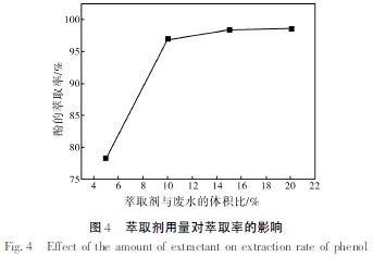 在pH=3~4、溫度30 ℃、萃取劑5%TBP-環(huán)己烷的條件下,攪拌30 min,考察萃取劑用量對萃取率的影響,分別采用廢水體積的5%、10%、15%、20% 的量加入萃取劑進(jìn)行萃取(見圖4)。