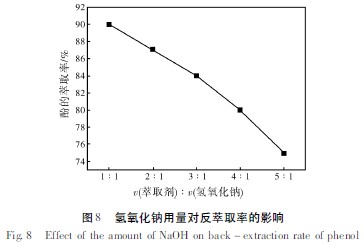 由圖8 可知,當(dāng)含酚有機(jī)相與NaOH 溶液的體積比為1∶1時,其反萃取率為90%; 隨著體積比不斷增加,其反萃取率卻隨之降低; 當(dāng)體積比為5∶1 時,其反萃取率下降至75%。若采用較低體積比的多級萃取,會產(chǎn)生大量的反萃取堿液,且氧氧化鈉溶液的利用率會很低。因此,采用體積比1∶1 比較合適。