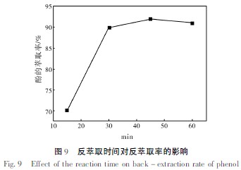 于50 ℃在有機(jī)相中加入等體積的10%NaOH 溶液,分別攪拌15、30、45、60 min,其結(jié)果見圖9。由圖9 可知,攪拌30 min 后再延長時間反萃取率變化不大,因此,攪拌時間以30 min 為宜。