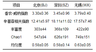 (2) 不同城市污水處理廠活性污泥系統(tǒng)內(nèi)真核微生物多樣性存在差異, 無錫群落的多樣性(豐富度和香農(nóng)-威納多樣性指數(shù))最高, 北京的最低, 且3個(gè)城市的活性污泥系統(tǒng)內(nèi)真核微生物群落結(jié)構(gòu)存在顯著的地域性差異.