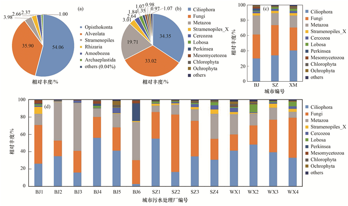 (a)整體尺度, Supergroup水平; (b)整體尺度, Division水平; (c)城市尺度, Devision水平; (d)污水處理廠尺度, Devision水平(相對(duì)豐度小于1.0%的統(tǒng)一劃歸為others)圖 2 不同尺度/水平下活性污泥系統(tǒng)內(nèi)真核微生物群落組成