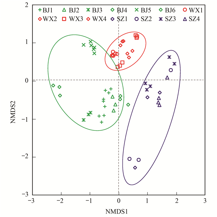 本研究使用了非度量多維尺度法(nonmetric multidimensional scaling, NMDS)和相異性分析非參數(shù)檢驗(yàn)方法ADONIS(permutational multivariate analysis of variance)、ANOSIM(analysis of similarities)和MRPP(multi-response permutation procedure)檢驗(yàn)北京、深圳和無錫這3個(gè)城市微生物群落結(jié)構(gòu)的差異, 采用多元回歸矩陣分析(multiple regression on distance matrix, MRM)和partial mantel test分析確定影響群落結(jié)構(gòu)的重要因素.以上分析通過R語言vegan、ape、ecodist程序包和Excel完成.