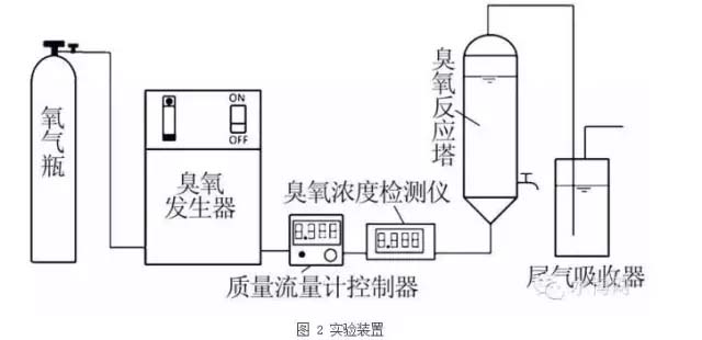 臭氧氧化反應(yīng)采用圖2所示的實驗裝置,主要由氧氣瓶、臭氧發(fā)生器、質(zhì)量流量控制器、臭氧反應(yīng)塔和尾氣吸收器等組成。其中臭氧反應(yīng)塔為內(nèi)徑56mm、高度840mm、有效容積1.8L的豎式玻璃管。底部設(shè)有氣體分散器,臭氧進入反應(yīng)塔后由分散器分散成微小氣泡。