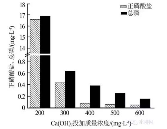 水質(zhì)同2.6,考察了不同Ca(OH)2投加量對氧化后廢水中磷去除率的影響。實驗所用水樣初始總磷質(zhì)量濃度為50.2mg/L,正磷酸鹽質(zhì)量濃度為49.9mg/L。Ca(OH)2的投加質(zhì)量濃度分別為200、300、400、500、600mg/L,其對總磷和正磷酸鹽去除的實驗結(jié)果如圖4所示。