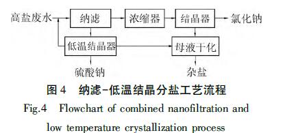 圖4 是一種納濾與低溫結(jié)晶耦合實(shí)現(xiàn)硫酸鈉和氯化鈉的分離和結(jié)晶的分鹽結(jié)晶工藝流程。經(jīng)過(guò)預(yù)處理的高鹽廢水進(jìn)入在室溫下運(yùn)行的納濾系統(tǒng),納濾濃水中的硫酸鈉被濃縮至7%以上,之后降溫至接近0 ℃后進(jìn)入低溫結(jié)晶器,結(jié)晶后經(jīng)固液分離得到十水硫酸鈉結(jié)晶鹽,部分低溫結(jié)晶器上清液送回納濾系統(tǒng)進(jìn)口循環(huán)處理。納濾透過(guò)液經(jīng)高壓反滲透或蒸發(fā)濃縮器濃縮后進(jìn)入高溫結(jié)晶器,結(jié)晶得到氯化鈉固體。從低溫結(jié)晶器和高溫結(jié)晶器排出的母液干化后得到雜鹽。